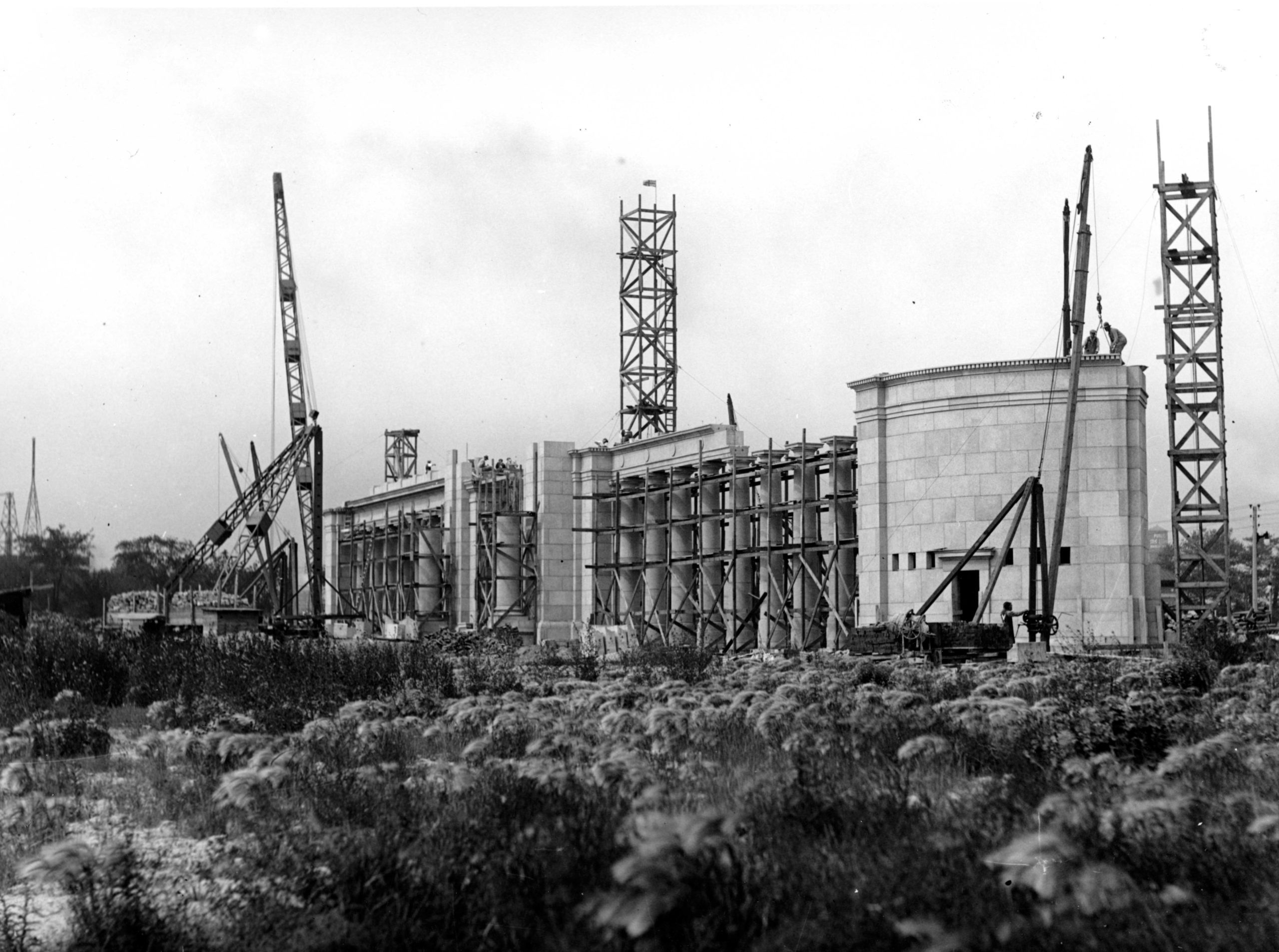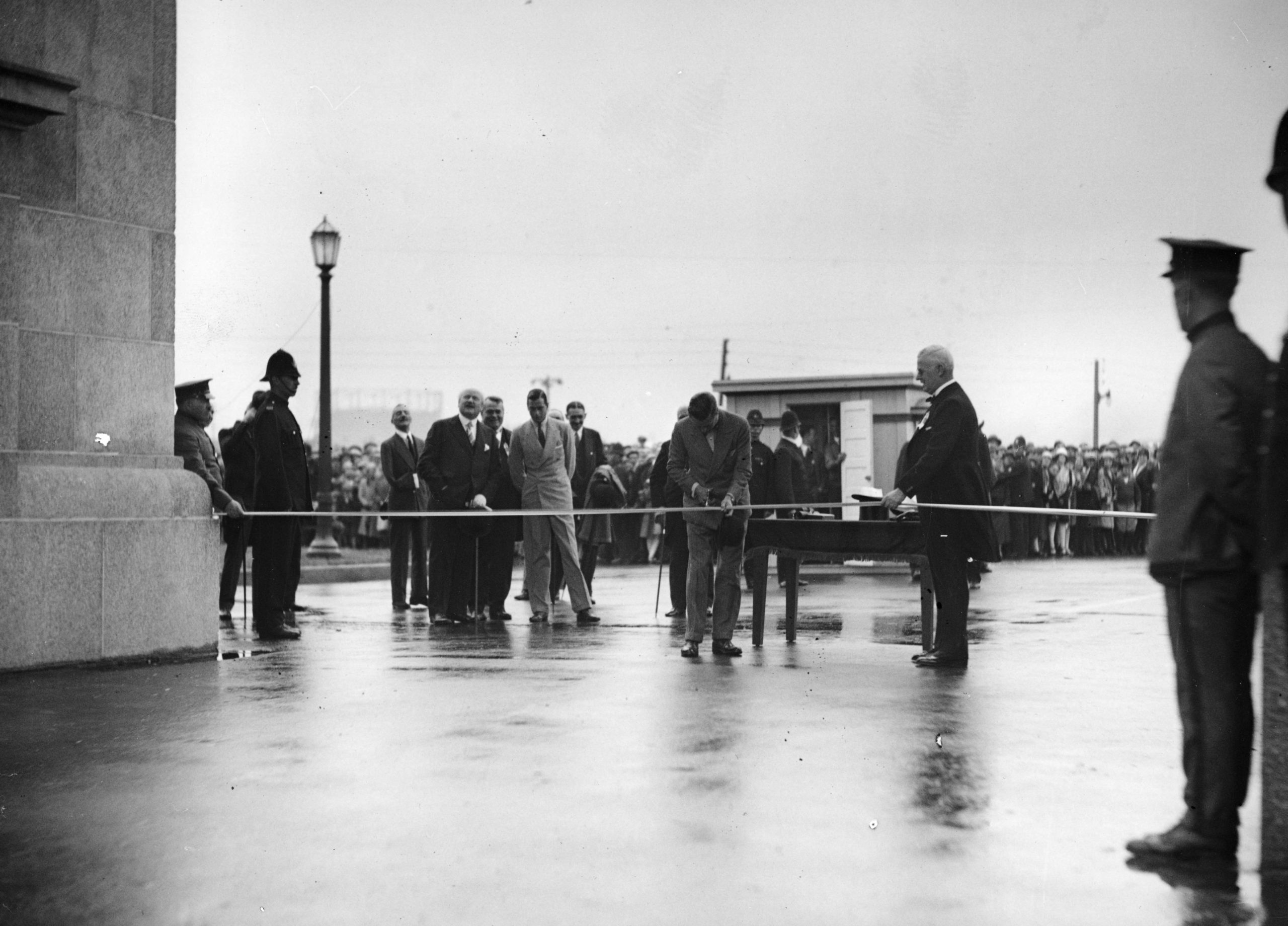 In 1924, the CNE Association hired the architectural firm of Chapman and Oxley to create a fifty- year plan for the redevelopment of the eastern end of the CNE grounds. A significant feature of this plan was the construction of a monumental entrance to link the CNE with the city of Toronto. This entranceway, built in 1927 on the 60th anniversary of the Confederation of Canada, was originally named “The Diamond Jubilee of Confederation Gates.” When it was learned that Prince Edward and Prince George would visit the CNE in 1927, the Gates were renamed the Princes’ Gates in honour of the two royal brothers. Prince Edward, provided with gold scissors, cut the purple ribbon to officially open the Princes’ Gates on August 30, 1927.